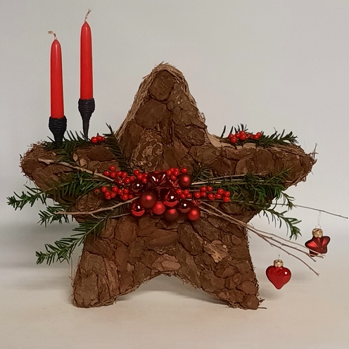We maken dit bloemstuk voor de prijs van 25 euro . De Ster kan ook opgehangen worden, wie het aan de voordeur wil ophangen kan de kaarsjes vervangen door lichtjes rondom de ster. (Dan zal er wel een kleine meerprijs zijn)