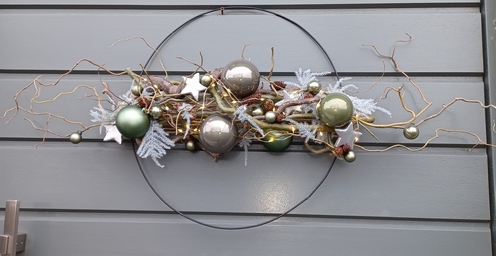 We maken dit kerststuk ( deur-of muurstuk )voor de prijs van 30 euro, (het kerststuk op staander ) voor de prijs van 35 euro (batterijen niet inbegrepen ). De kleuren van de kerstballen kunnen in functie van jullie interieur of wensen aangepast worden. Gelieve de gewenste kleuren mee te delen bij jullie inschrijving.